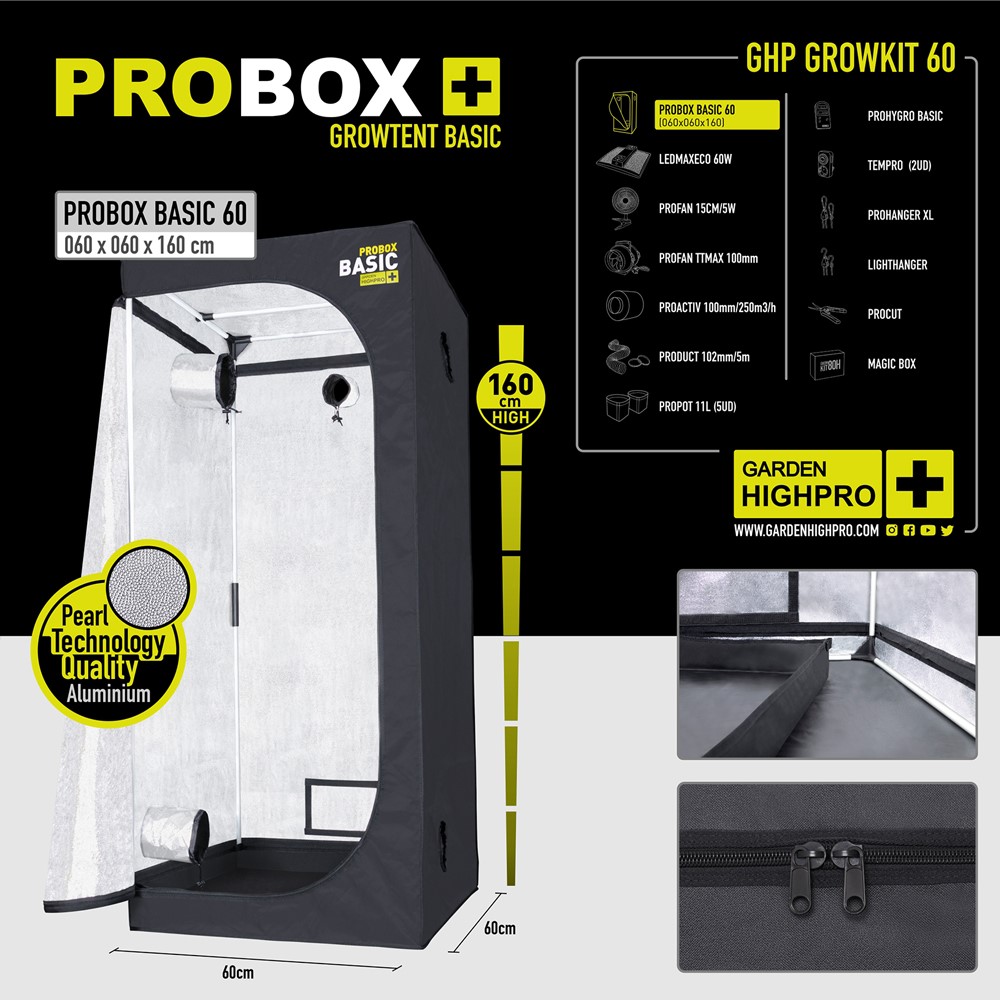 PROBOX BASIC: Kompaktní a robustní, rozměry 60x60x160cm, ideální pro maximalizaci vašeho prostoru a optimalizaci růstu vašich rostlin v kontrolovaném prostředí. 1ks